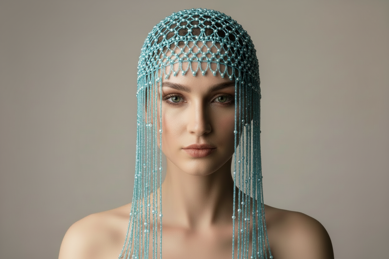 A dramatic, full-length beaded headpiece designed to move beautifully with you. Featuring cascading strands and intricate beadwork, this piece creates effortless shimmer and fluid movement from every angle.