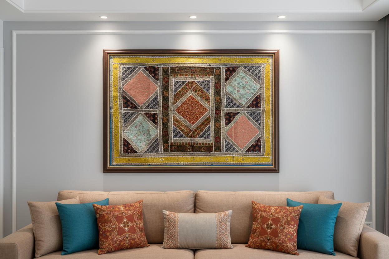 Wall hangings as such have been around for centuries. They are made using recycled cotton cloths from saris, and are hand-woven together almost like a large Indian quilt. They include an incredible amount of handworked sequins, fabrics, and designs. This wall hanging is a traditional Indian art piece that is sure to compliment your home.
