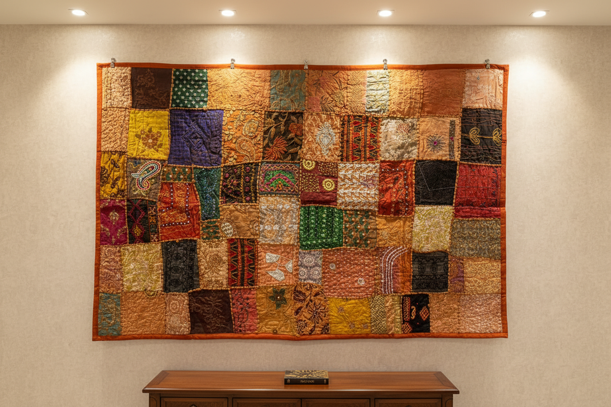 Wall hangings as such have been around for centuries. They are made using recycled cotton cloths from saris, and are hand-woven together almost like a large Indian quilt. They include an incredible amount of handworked sequins, fabrics, and designs. This wall hanging is a traditional Indian art piece that is sure to compliment your home.