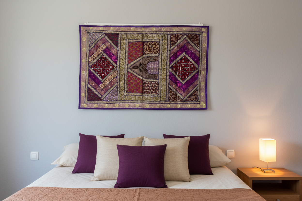 Wall hangings as such have been around for centuries. They are made using recycled cotton cloths from saris, and are hand-woven together almost like a large Indian quilt. They include an incredible amount of handworked sequins, fabrics, and designs. This wall hanging is a traditional Indian art piece that is sure to compliment your home.