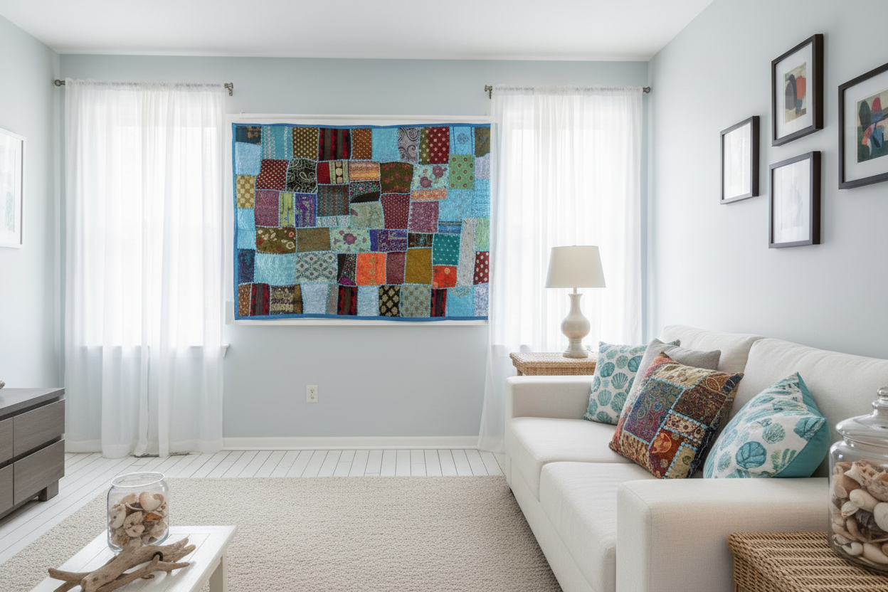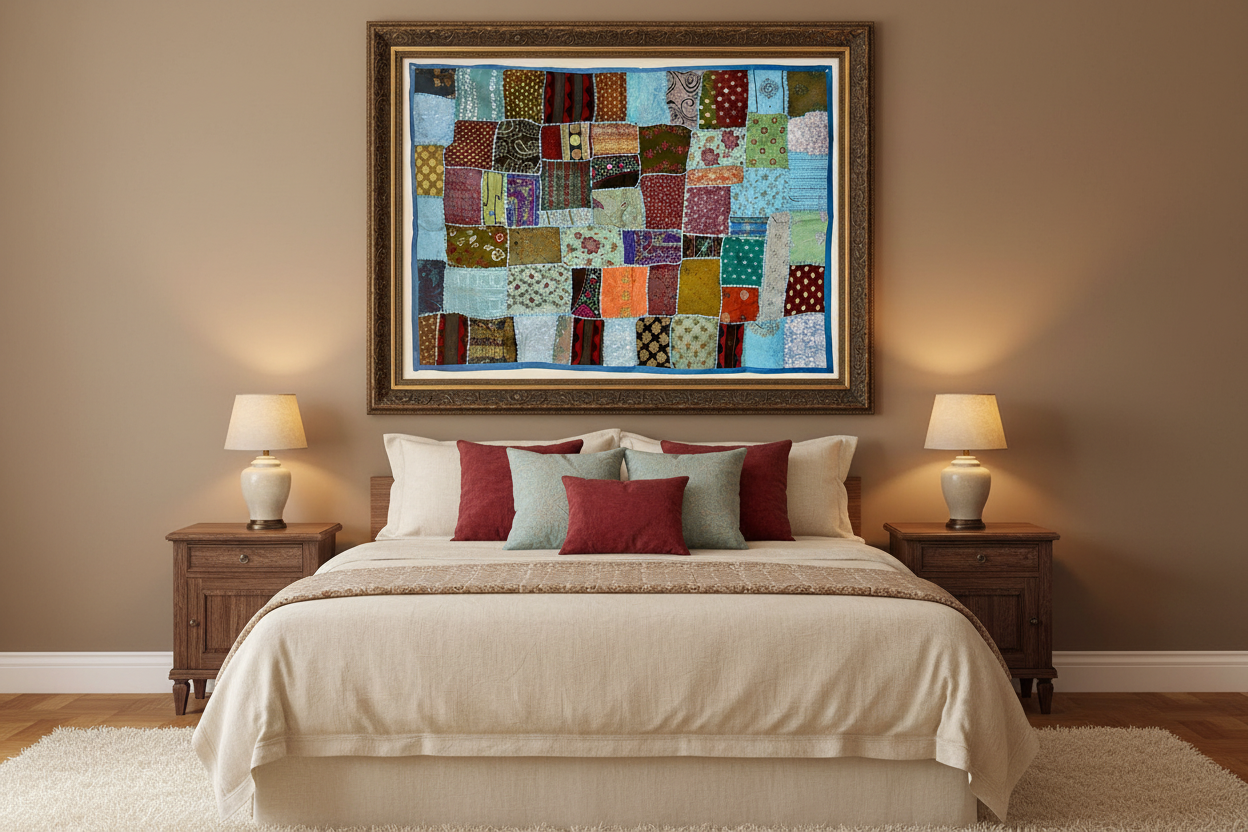 Wall hangings as such have been around for centuries. They are made using recycled cotton cloths from saris, and are hand-woven together almost like a large Indian quilt. They include an incredible amount of handworked sequins, fabrics, and designs. This wall hanging is a traditional Indian art piece that is sure to compliment your home.